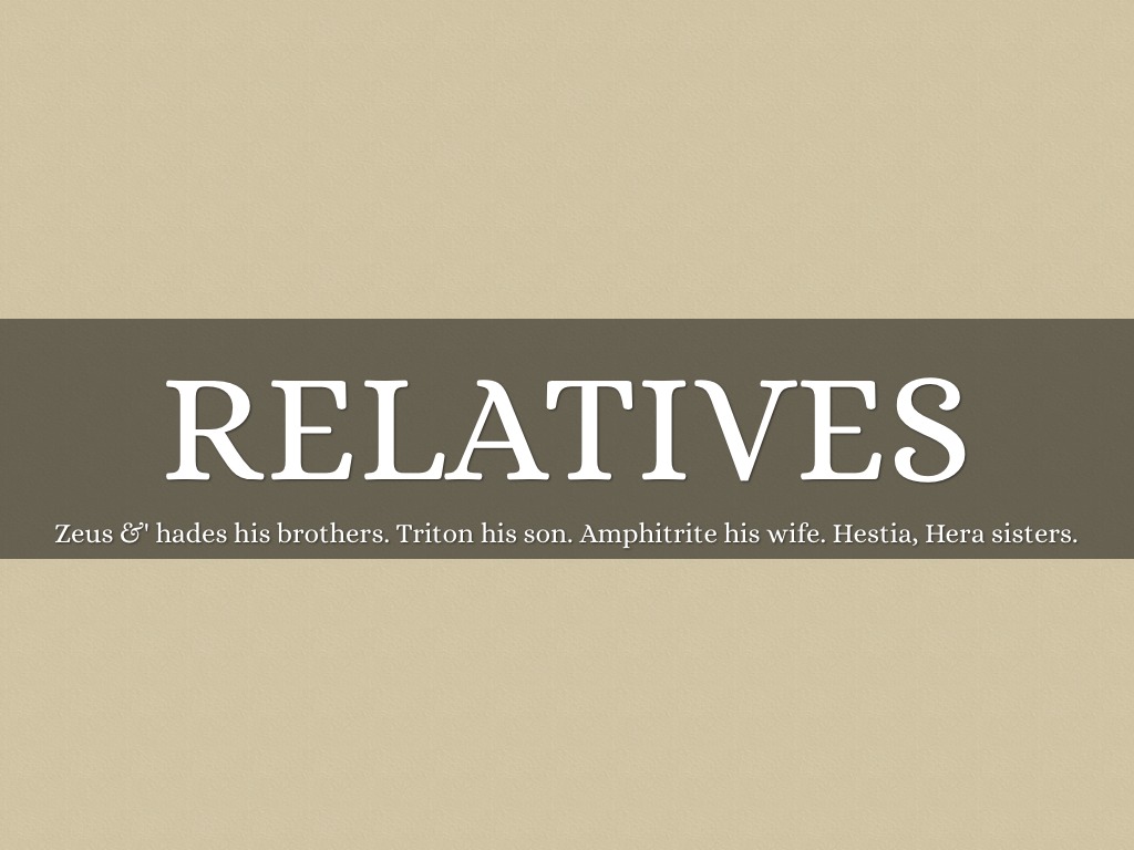 Zeus &' hades his brothers. Triton his son. Amphitrite his wife. Hestia, Hera sisters.