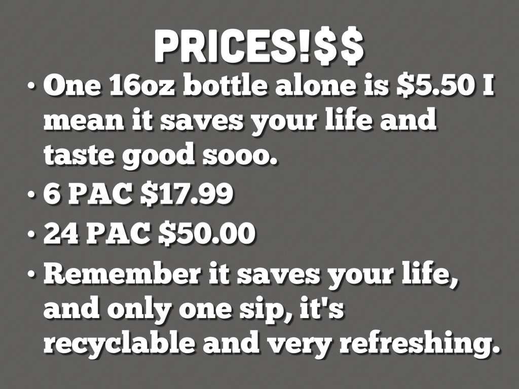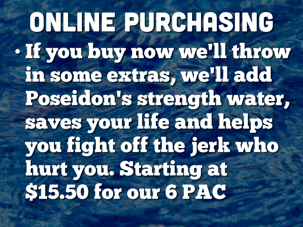 If you buy now we'll throw in some extras, we'll add Poseidon's strength water, saves your life and helps you fight off the jerk who hurt you. Starting at $15.50 for our 6 PAC
