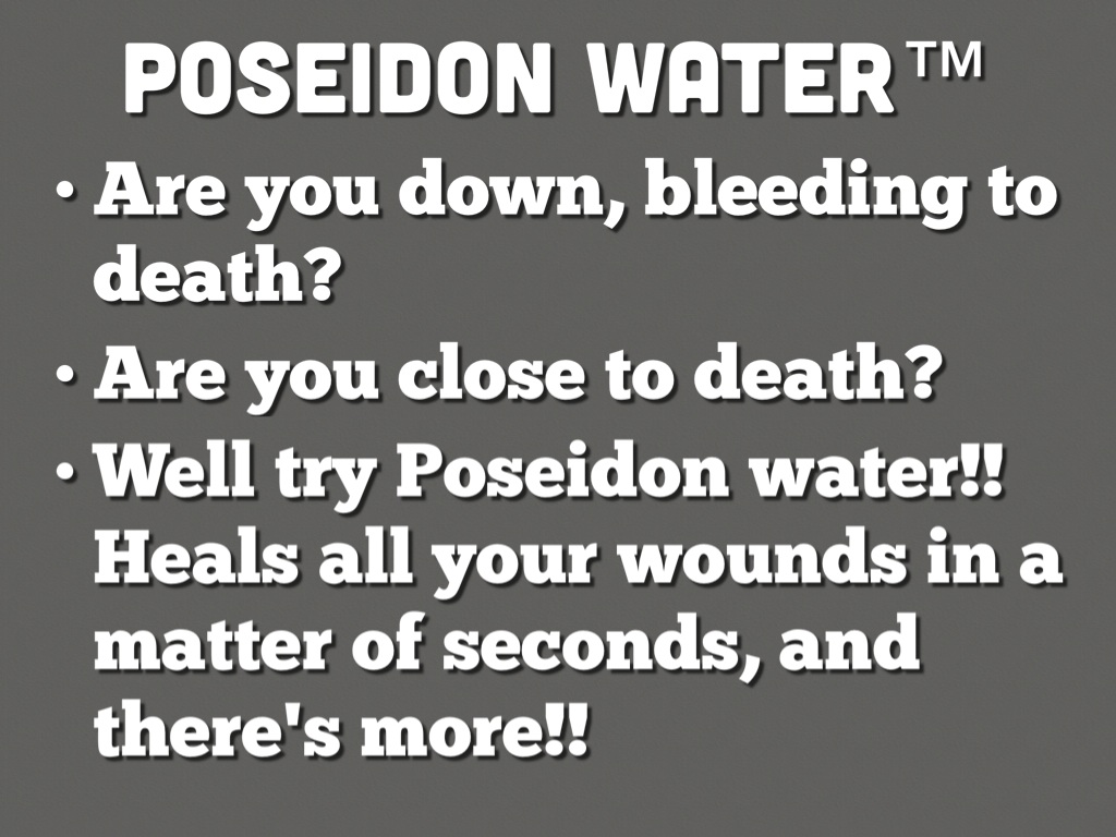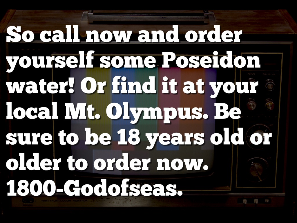 So call now and order yourself some Poseidon water! Or find it at your local Mt. Olympus. Be sure to be 18 years old or older to order now. 1800-Godofseas.
