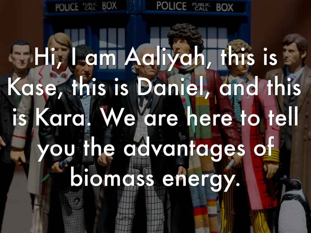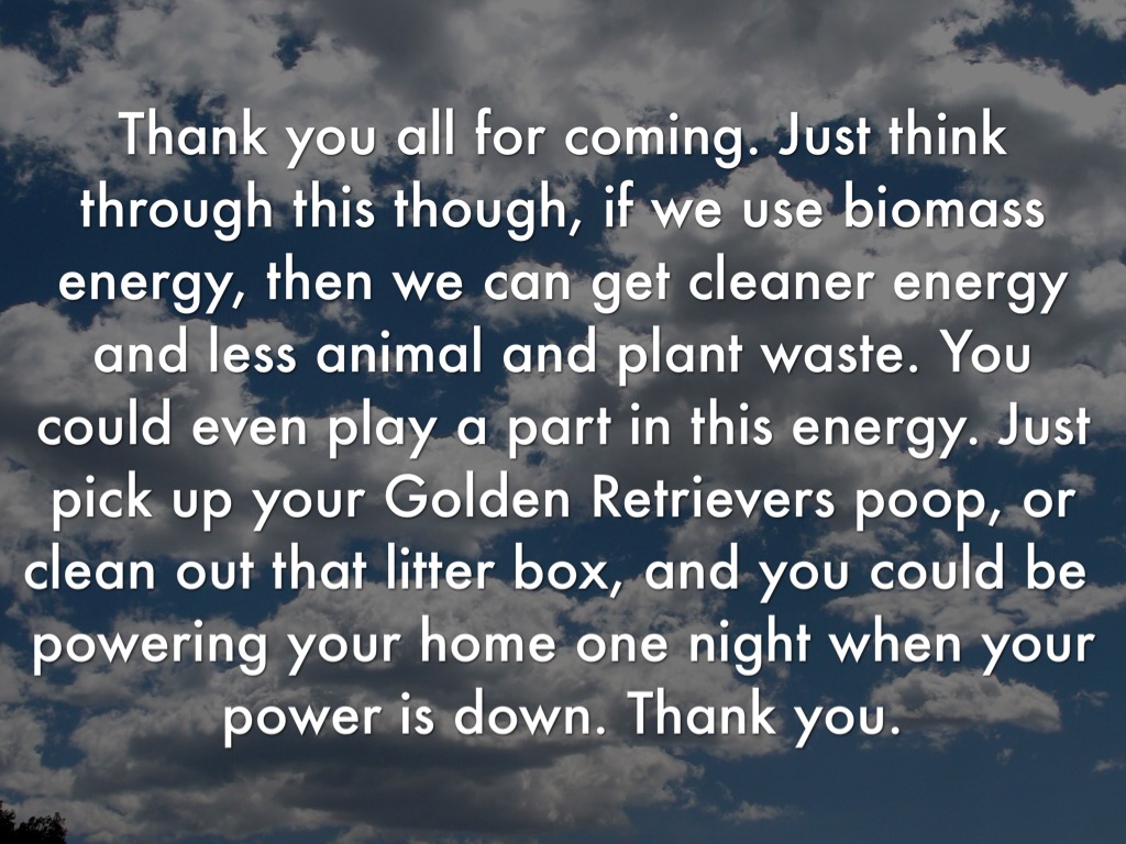 Thank you all for coming. Just think through this though, if we use biomass energy, then we can get cleaner energy and less animal and plant waste. You could even play a part in this energy. Just pick up your Golden Retrievers poop, or clean out that litter box, and you could be powering your home one night when your power is down. Thank you.
