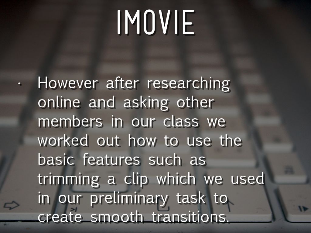 However after researching online and asking other members in our class we worked out how to use the basic features such as trimming a clip which we used in our preliminary task to create smooth transitions.
