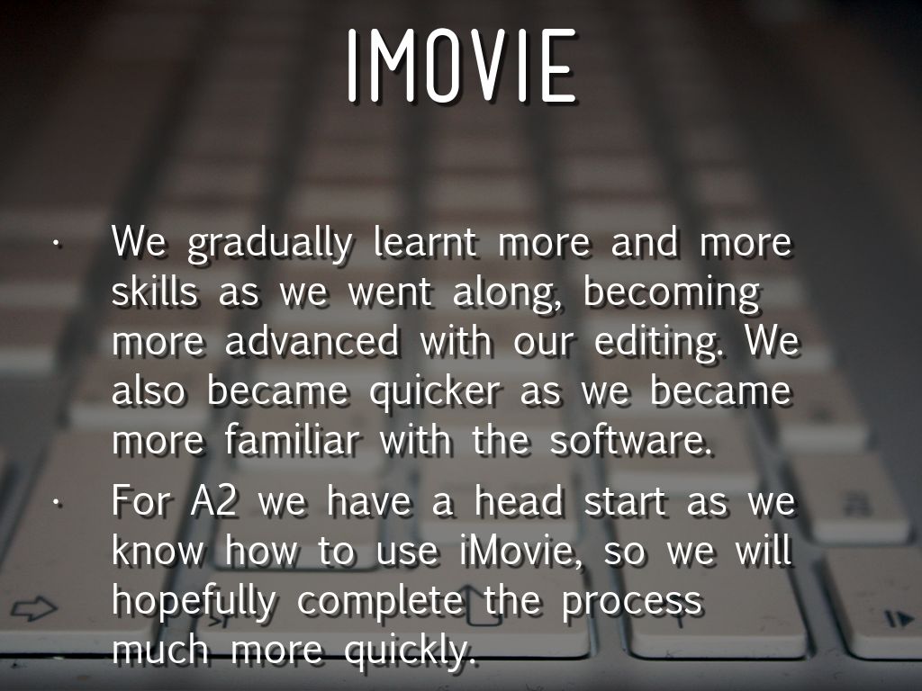 We gradually learnt more and more skills as we went along, becoming more advanced with our editing. We also became quicker as we became more familiar with the software.