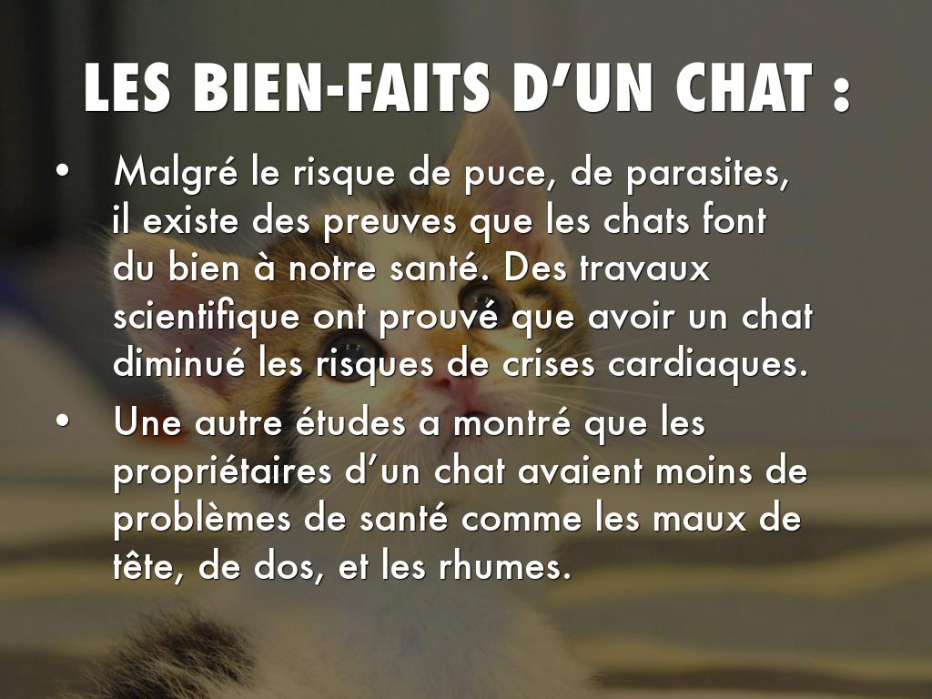 Malgré le risque de puce, de parasites, il existe des preuves que les chats font du bien à notre santé. Des travaux scientifique ont prouvé que avoir un chat diminué les risques de crises cardiaques.