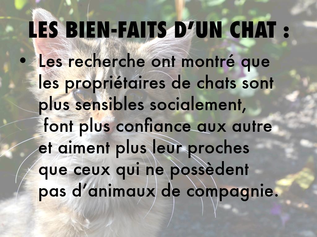 Les recherche ont montré que les propriétaires de chats sont plus sensibles socialement, font plus confiance aux autre et aiment plus leur proches que ceux qui ne possèdent pas d’animaux de compagnie.