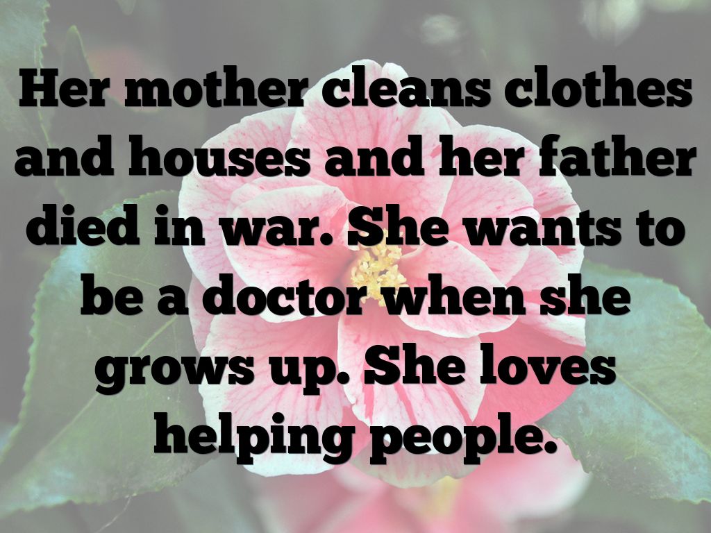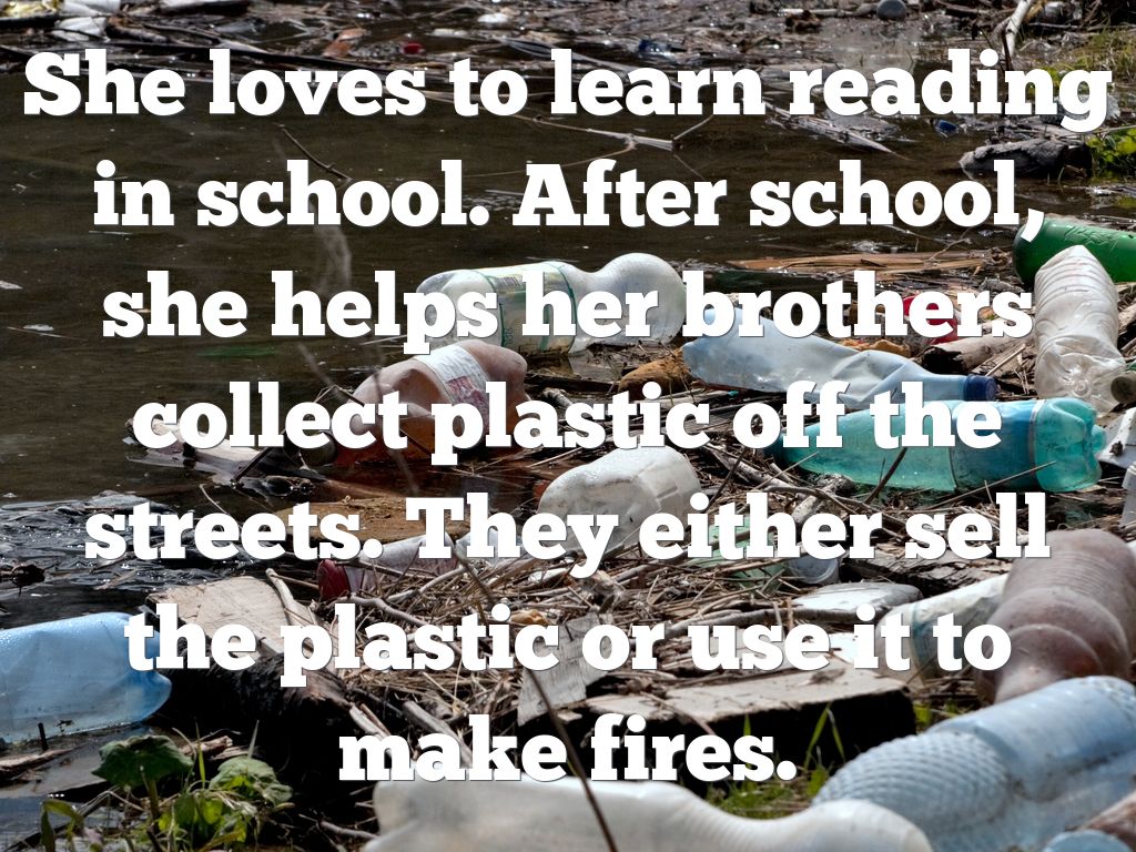 She loves to learn reading in school. After school, she helps her brothers collect plastic off the streets. They either sell the plastic or use it to make fires.