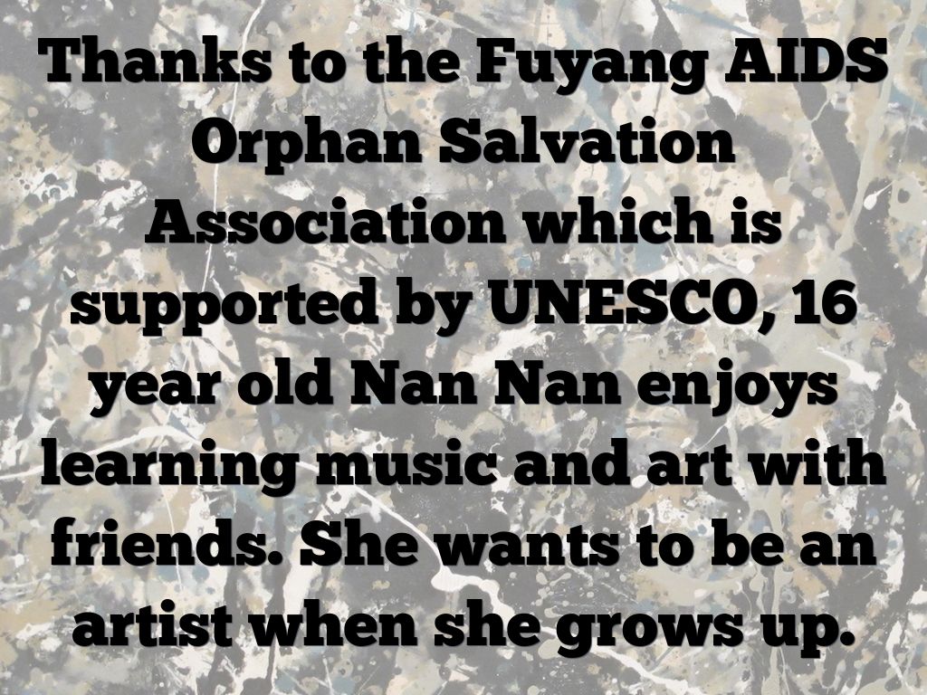 Thanks to the Fuyang AIDS Orphan Salvation Association which is supported by UNESCO, 16 year old Nan Nan enjoys learning music and art with friends. She wants to be an artist when she grows up.