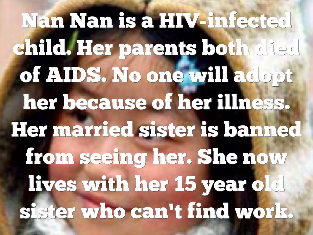 Nan Nan is a HIV-infected child. Her parents both died of AIDS. No one will adopt her because of her illness. Her married sister is banned from seeing her. She now lives with her 15 year old sister who can't find work.