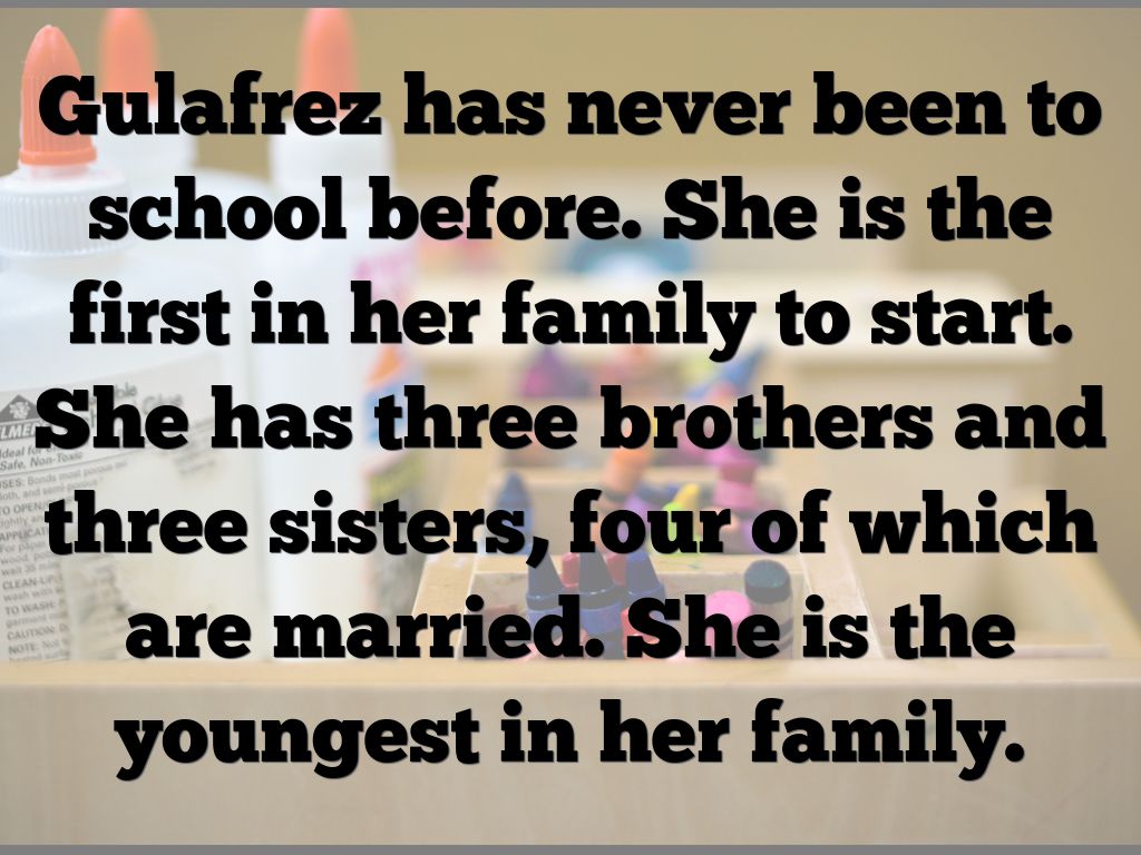 Gulafrez has never been to school before. She is the first in her family to start. She has three brothers and three sisters, four of which are married. She is the youngest in her family.