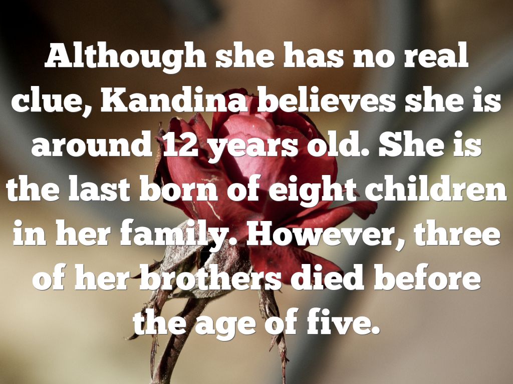 Although she has no real clue, Kandina believes she is around 12 years old. She is the last born of eight children in her family. However, three of her brothers died before the age of five.