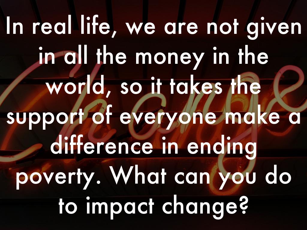 In real life, we are not given in all the money in the world, so it takes the support of everyone make a difference in ending poverty. What can you do to impact change?