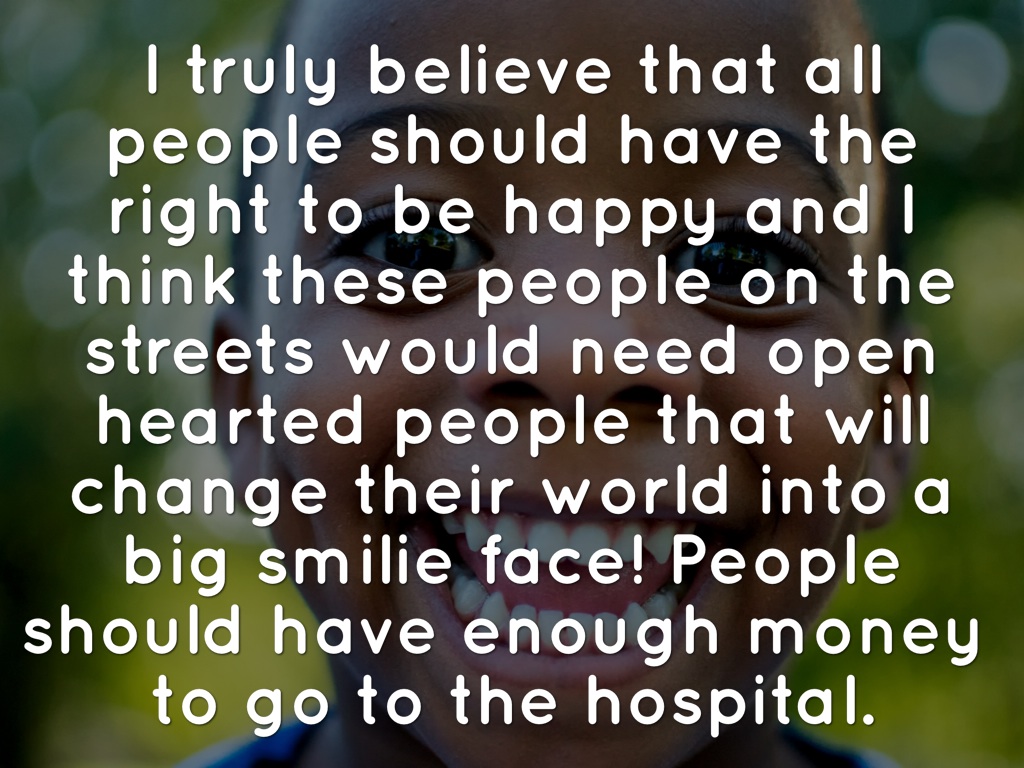 I truly believe that all people should have the right to be happy and I think these people on the streets would need open hearted people that will change their world into a big smilie face! People should have enough money to go to the hospital.