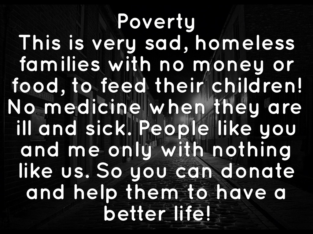 Poverty This is very sad, homeless families with no money or food, to feed their children! No medicine when they are ill and sick. People like you and me only with nothing like us. So you can donate and help them to have a better life!