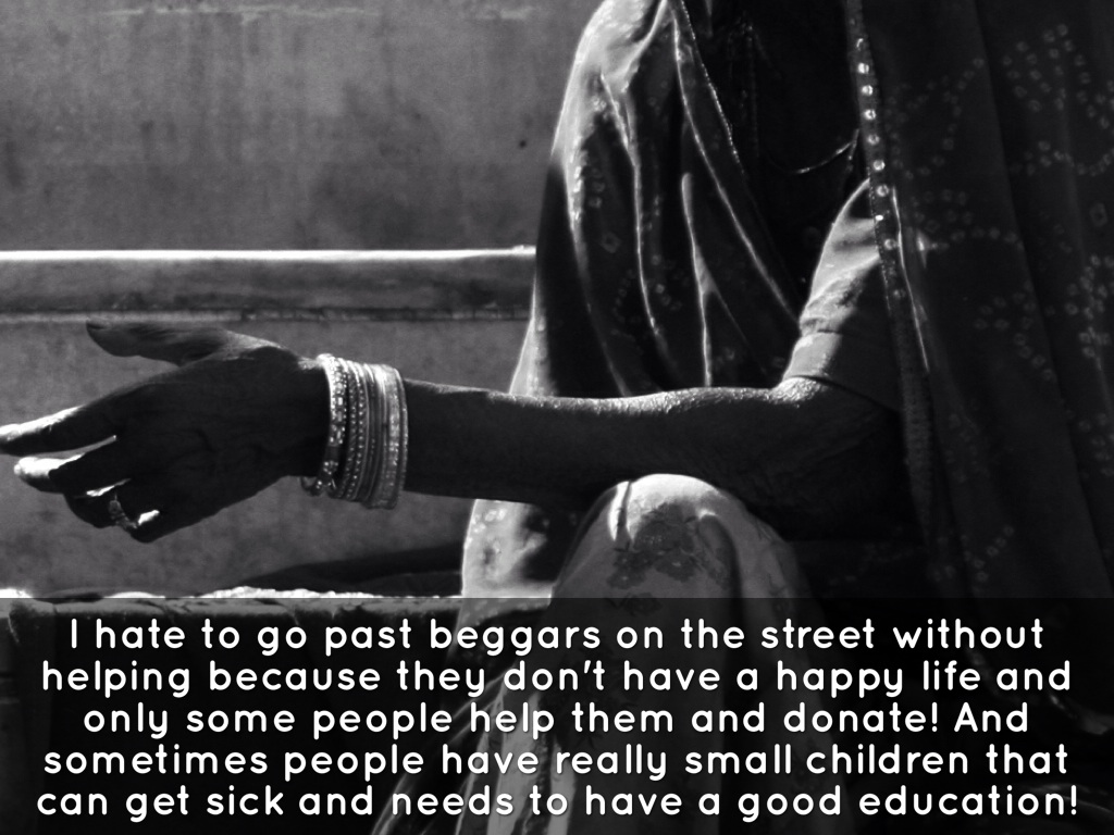 I hate to go past beggars on the street without helping because they don't have a happy life and only some people help them and donate! And sometimes people have really small children that can get sick and needs to have a good education!