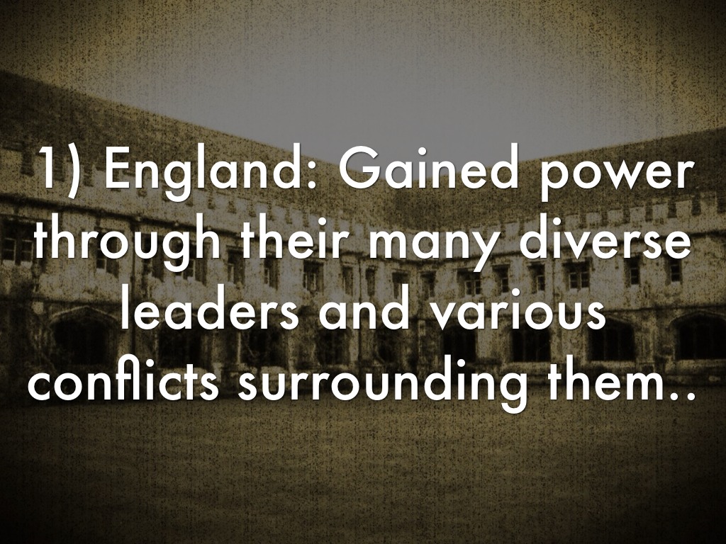 1) England: Gained power through their many diverse leaders and various conflicts surrounding them..