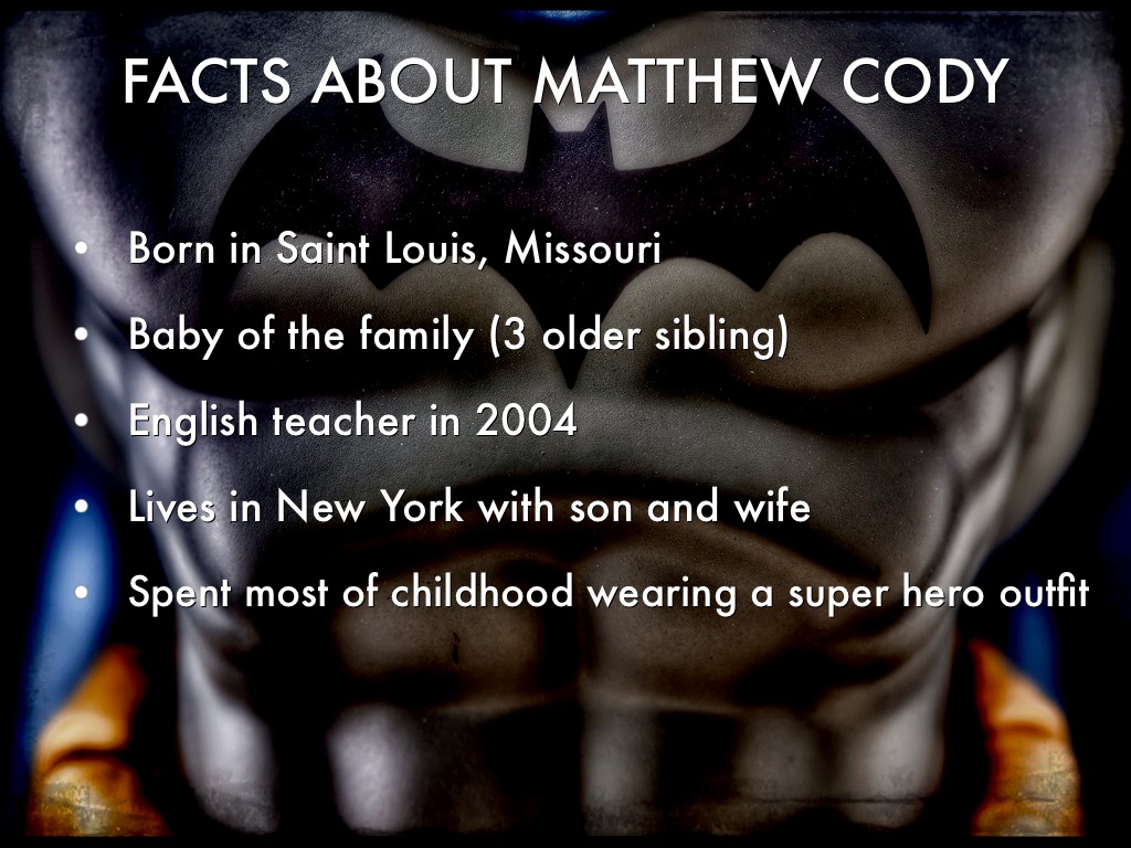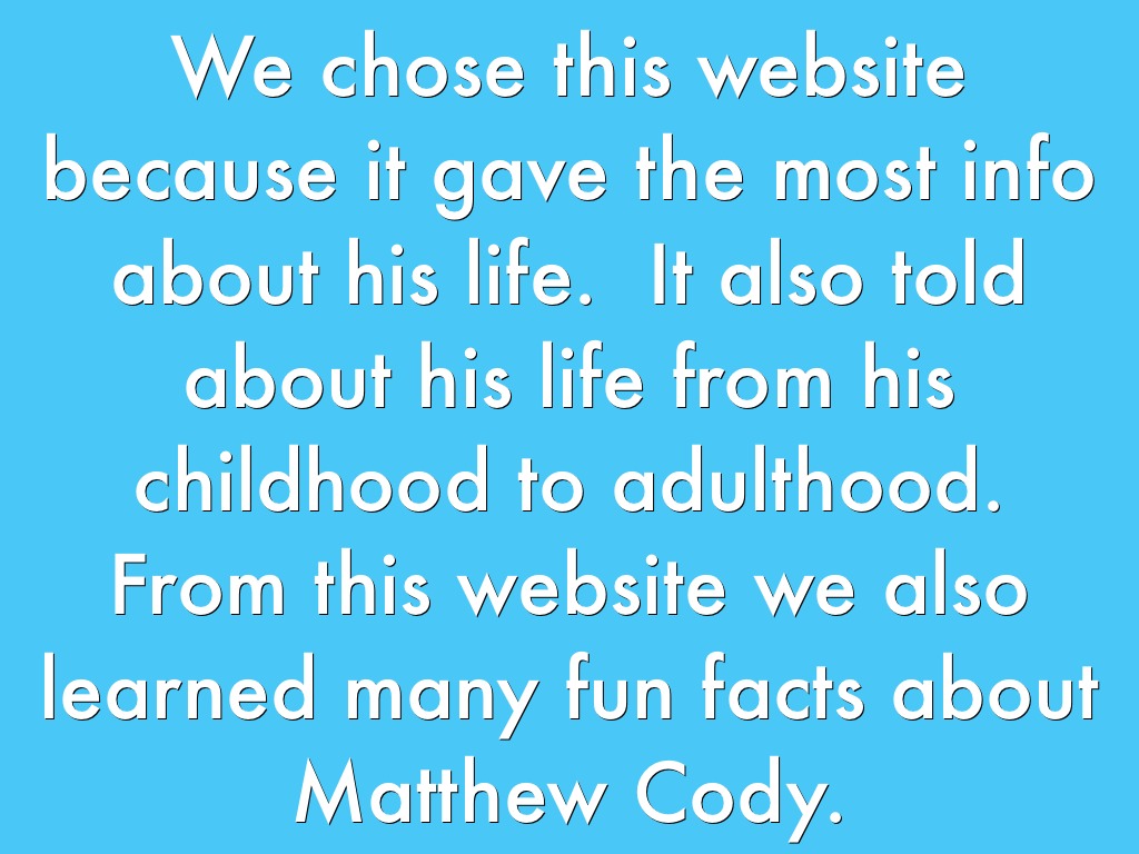 We chose this website because it gave the most info about his life. It also told about his life from his childhood to adulthood. From this website we also learned many fun facts about Matthew Cody.
