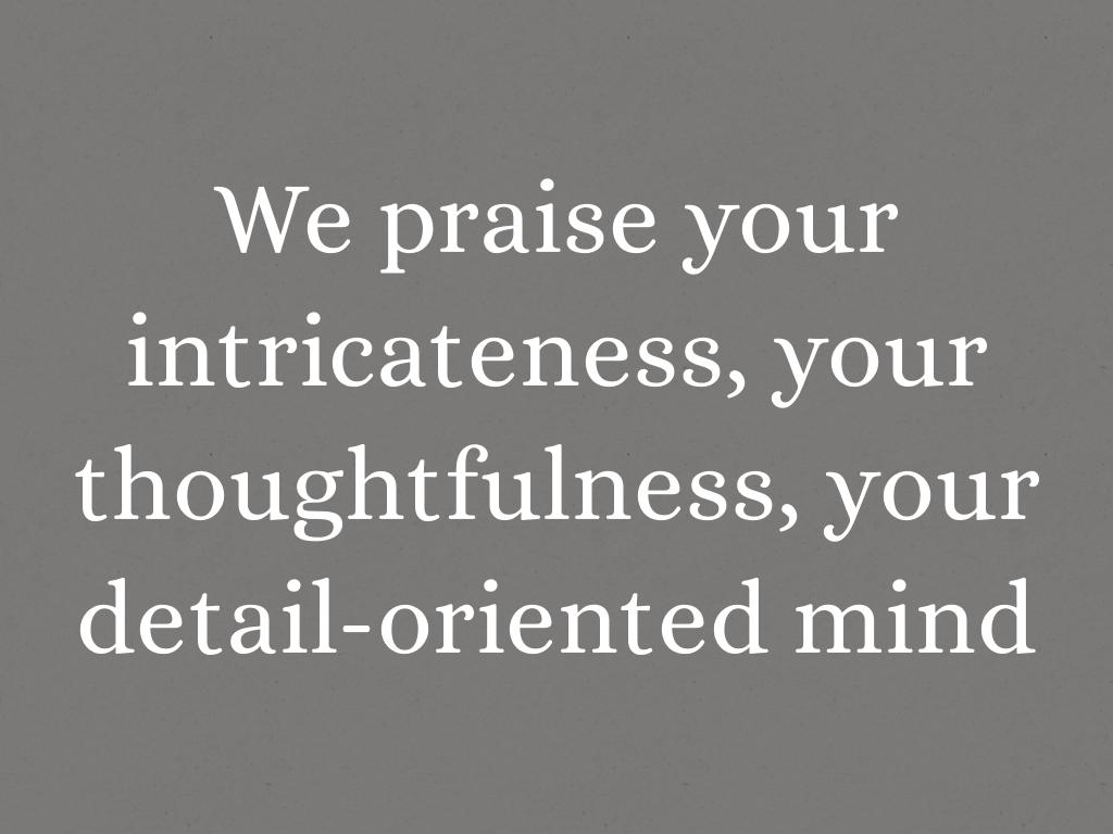 We praise your intricateness, your thoughtfulness, your detail-oriented mind