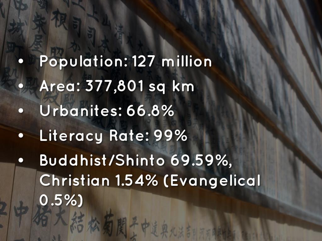 - Buddhist/Shinto 69.59%, Christian 1.54% (Evangelical 0.5%)