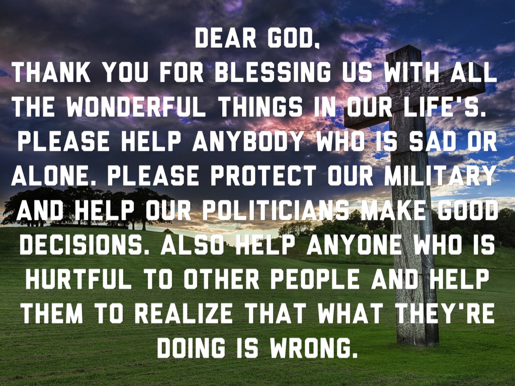 Dear God, Thank you for blessing us with all the wonderful things in our life's. Please help anybody who is sad or alone. Please protect our military and help our politicians make good decisions. Also help anyone who is hurtful to other people and help them to realize that what they're doing is wrong.