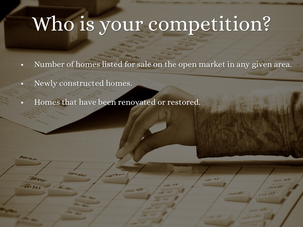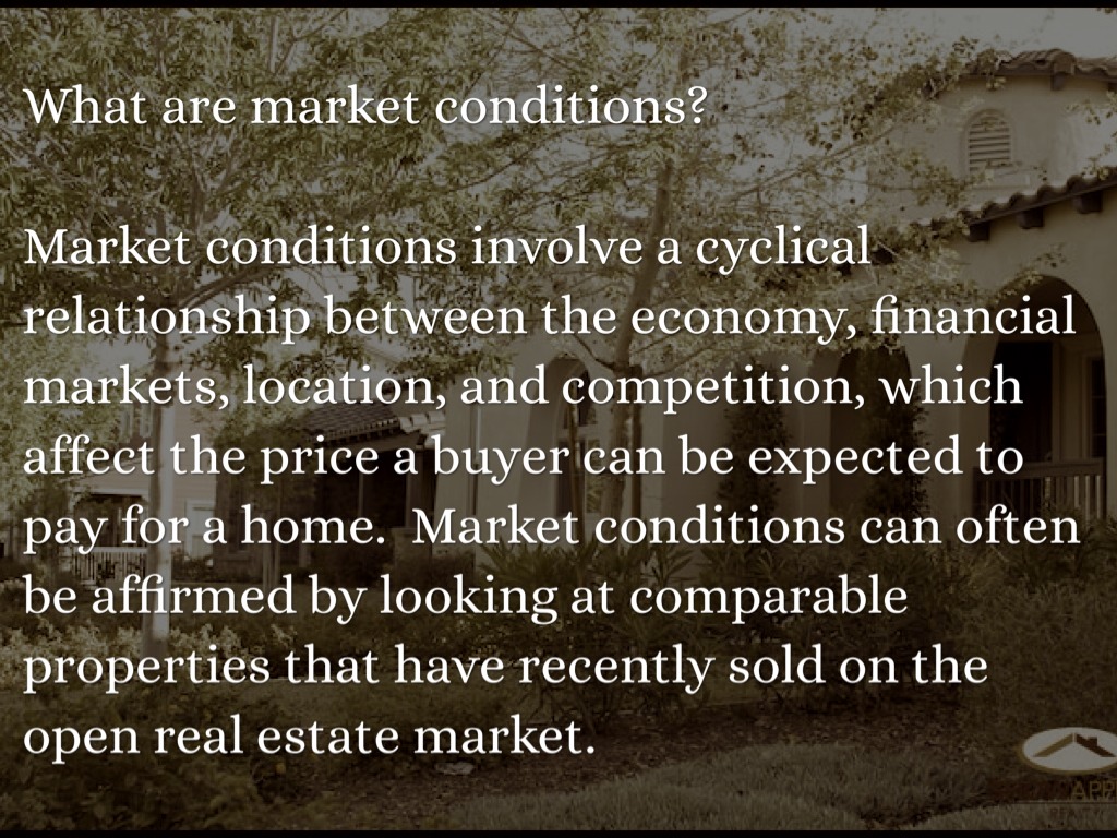Market conditions involve a cyclical relationship between the economy, financial markets, location, and competition, which affect the price a buyer can be expected to pay for a home. Market conditions can often be affirmed by looking at comparable properties that have recently sold on the open real estate market.
