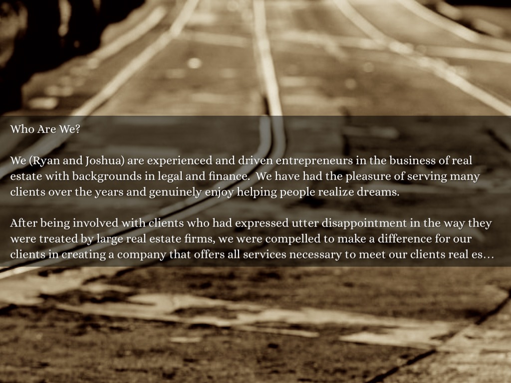 We (Ryan and Joshua) are experienced and driven entrepreneurs in the business of real estate with backgrounds in legal and finance. We have had the pleasure of serving many clients over the years and genuinely enjoy helping people realize dreams.