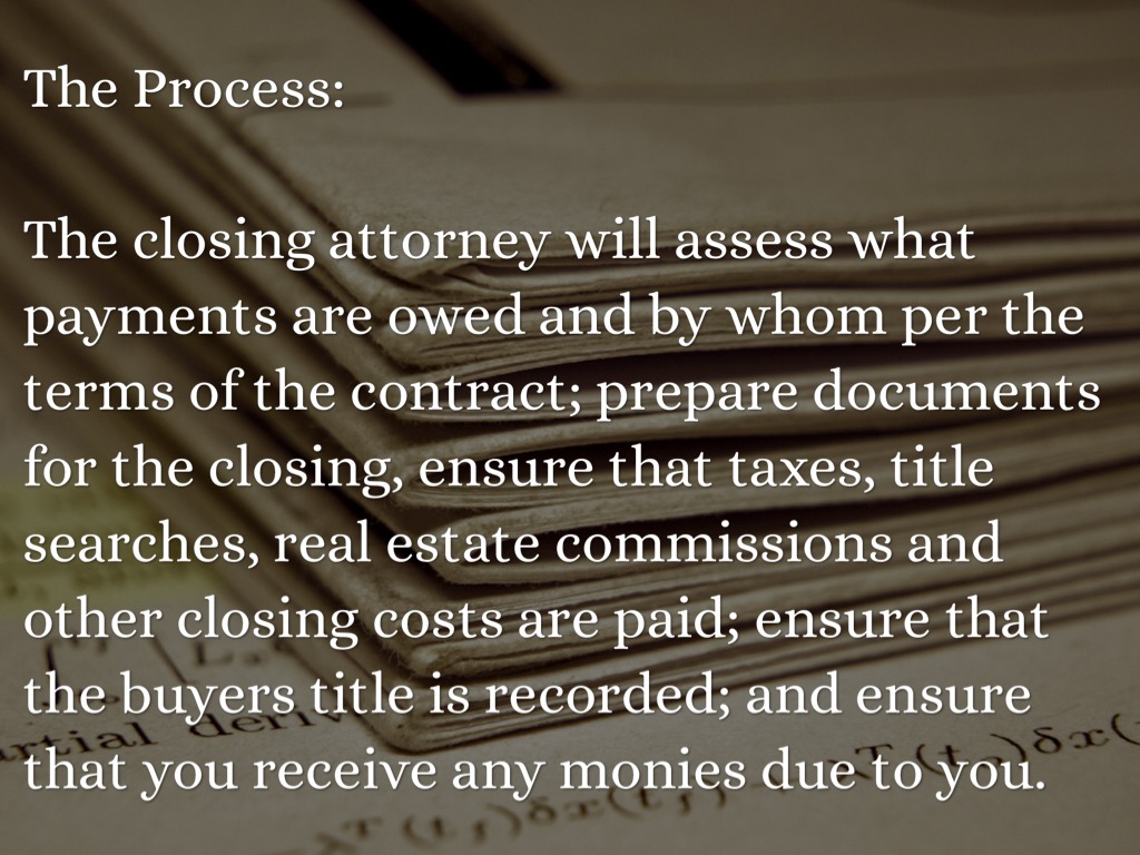 The closing attorney will assess what payments are owed and by whom per the terms of the contract; prepare documents for the closing, ensure that taxes, title searches, real estate commissions and other closing costs are paid; ensure that the buyers title is recorded; and ensure that you receive any monies due to you.