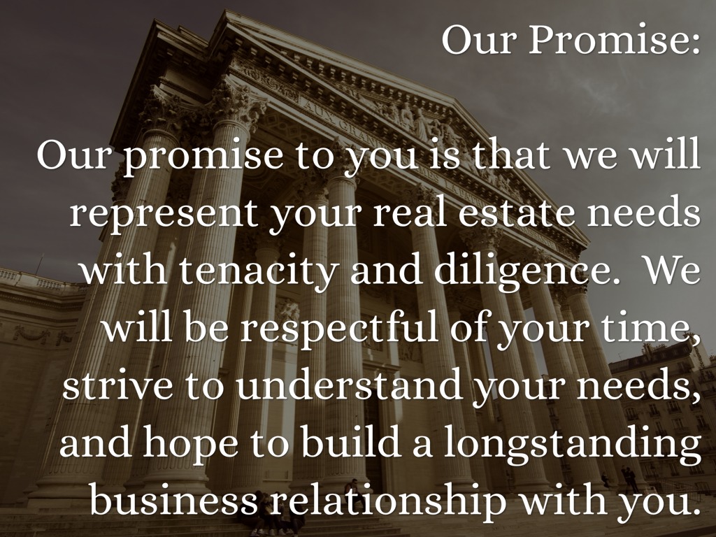 Our promise to you is that we will represent your real estate needs with tenacity and diligence. We will be respectful of your time, strive to understand your needs, and hope to build a longstanding business relationship with you.
