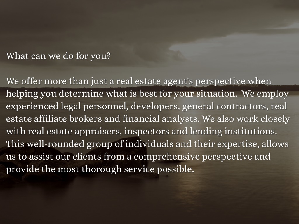 We offer more than just a real estate agent's perspective when helping you determine what is best for your situation. We employ experienced legal personnel, developers, general contractors, real estate affiliate brokers and financial analysts. We also work closely with real estate appraisers, inspectors and lending institutions. This well-rounded group of individuals and their expertise, allows us to assist our clients from a comprehensive perspective and provide the most thorough service possible.