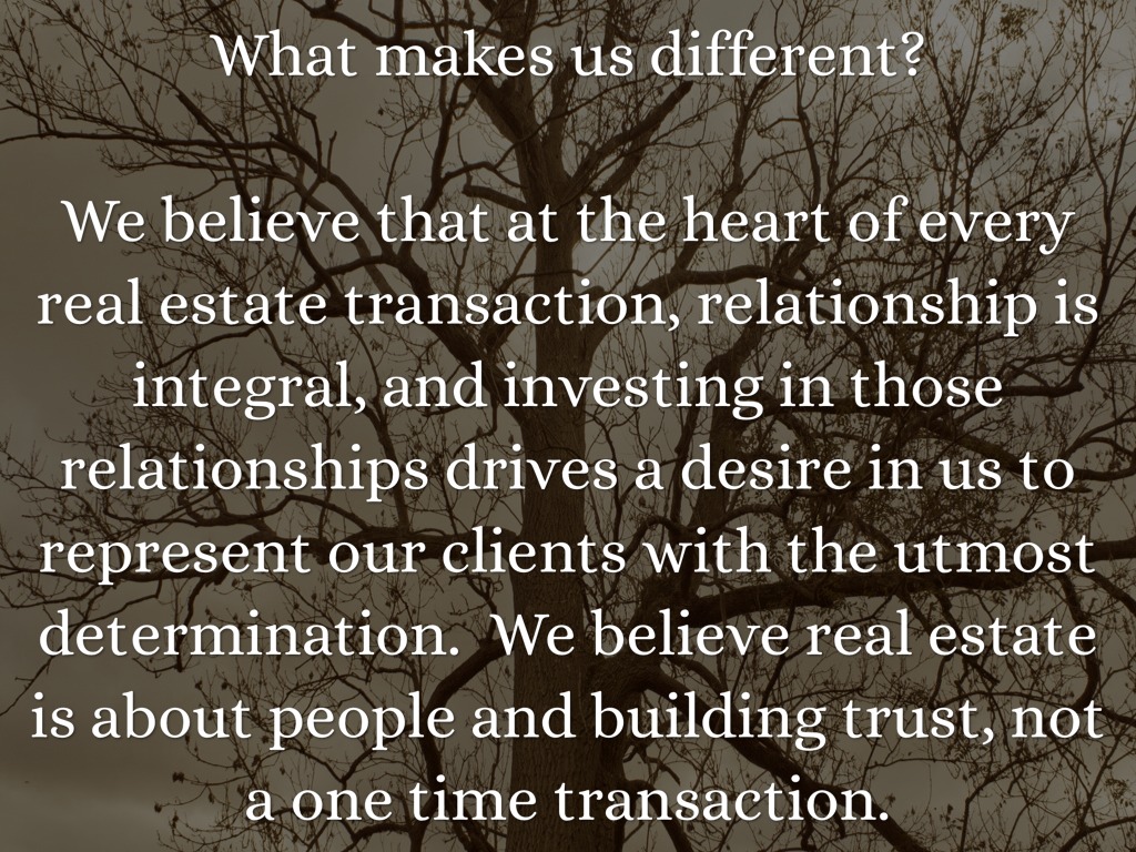 We believe that at the heart of every real estate transaction, relationship is integral, and investing in those relationships drives a desire in us to represent our clients with the utmost determination. We believe real estate is about people and building trust, not a one time transaction.