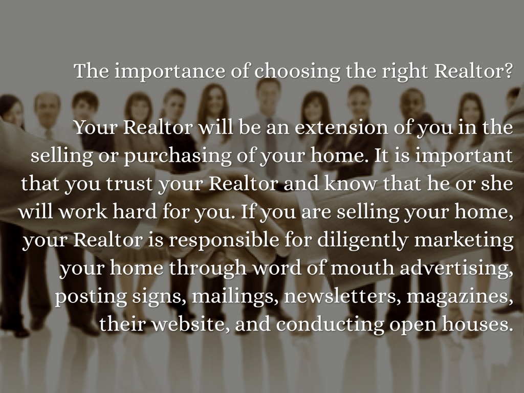 Your Realtor will be an extension of you in the selling or purchasing of your home. It is important that you trust your Realtor and know that he or she will work hard for you. If you are selling your home, your Realtor is responsible for diligently marketing your home through word of mouth advertising, posting signs, mailings, newsletters, magazines, their website, and conducting open houses.