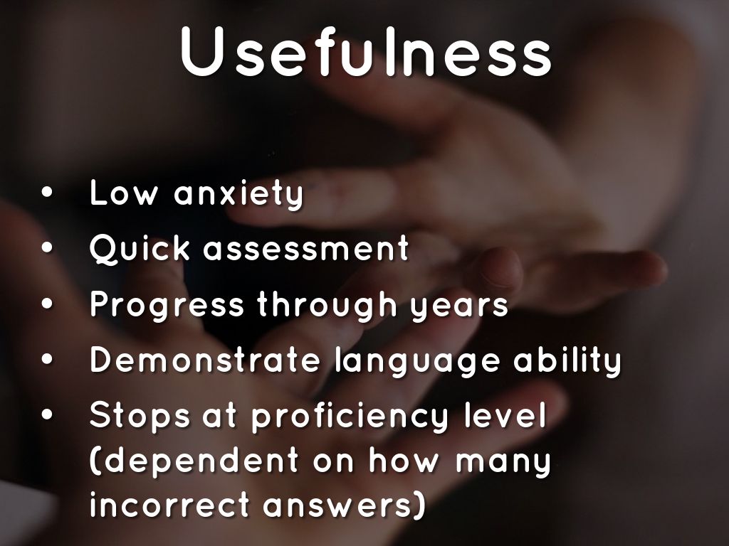 • Stops at proficiency level (dependent on how many incorrect answers)