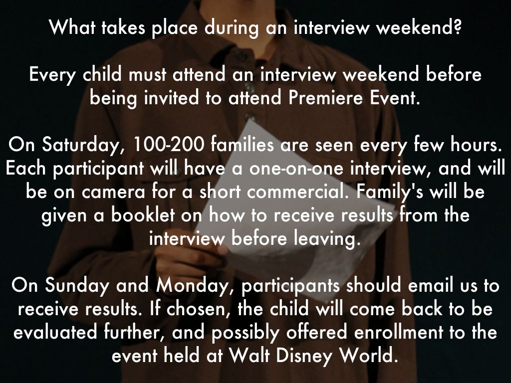 On Sunday and Monday, participants should email us to receive results. If chosen, the child will come back to be evaluated further, and possibly offered enrollment to the event held at Walt Disney World.