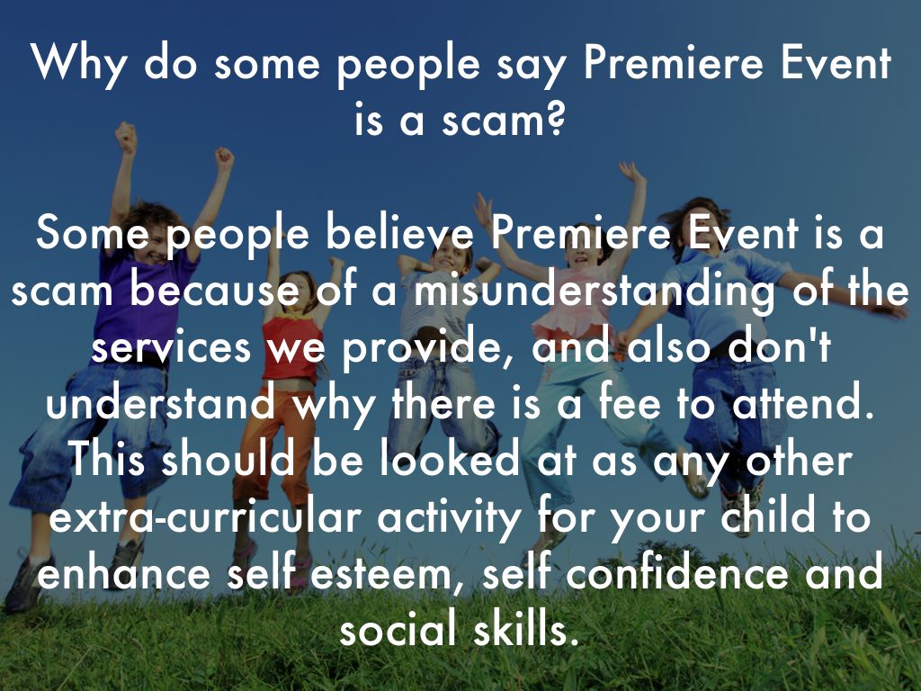 Some people believe Premiere Event is a scam because of a misunderstanding of the services we provide, and also don't understand why there is a fee to attend. This should be looked at as any other extra-curricular activity for your child to enhance self esteem, self confidence and social skills.
