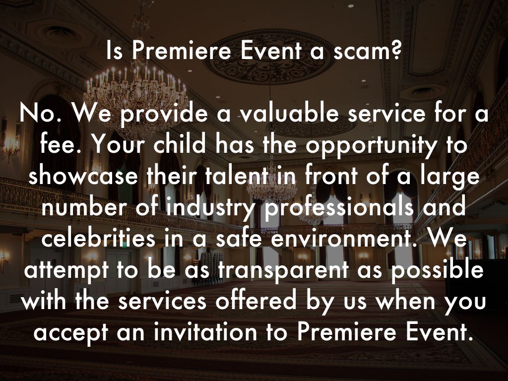 No. We provide a valuable service for a fee. Your child has the opportunity to showcase their talent in front of a large number of industry professionals and celebrities in a safe environment. We attempt to be as transparent as possible with the services offered by us when you accept an invitation to Premiere Event.