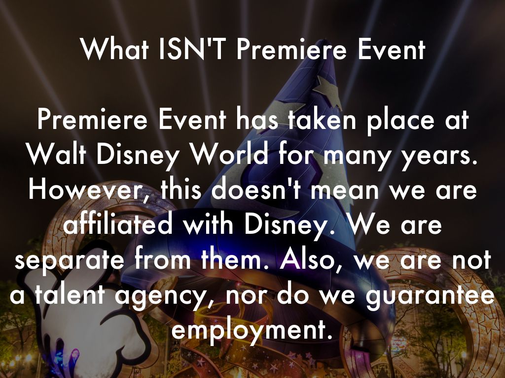 Premiere Event has taken place at Walt Disney World for many years. However, this doesn't mean we are affiliated with Disney. We are separate from them. Also, we are not a talent agency, nor do we guarantee employment.