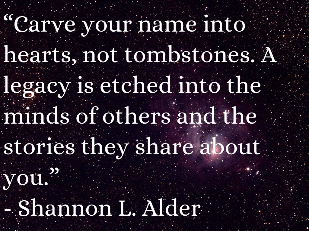 “Carve your name into hearts, not tombstones. A legacy is etched into the minds of others and the stories they share about you.”