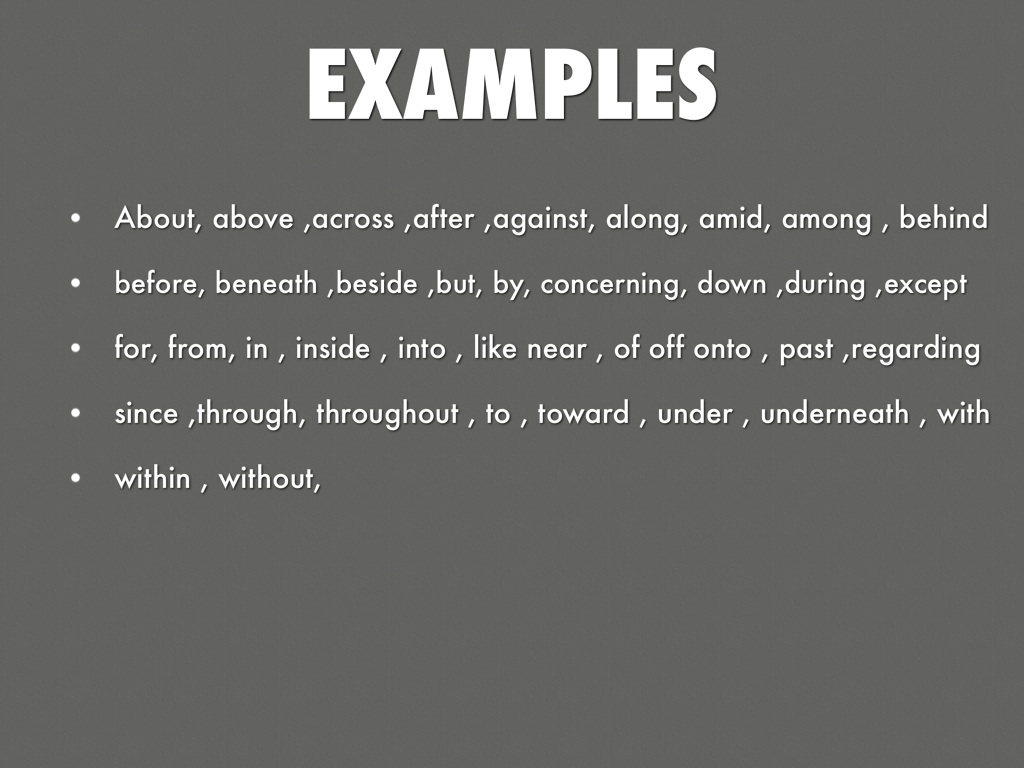 before, beneath ,beside ,but, by, concerning, down ,during ,except