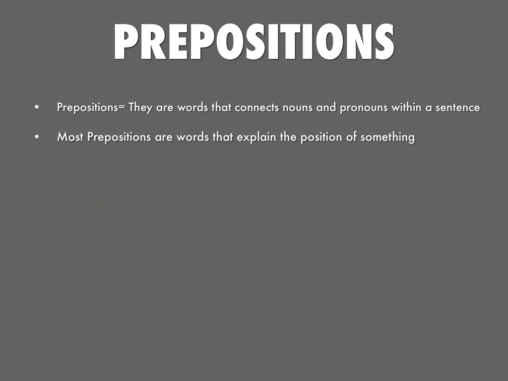 Prepositions= They are words that connects nouns and pronouns within a sentence