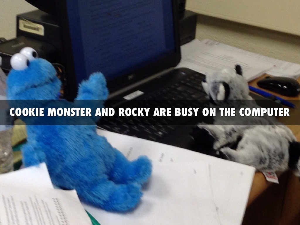 COOKIE MONSTER AND ROCKY ARE BUSY ON THE COMPUTER