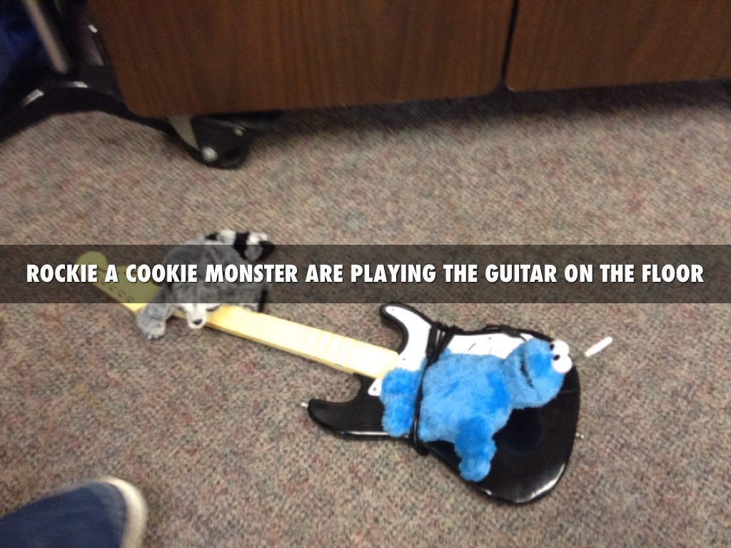 ROCKIE A COOKIE MONSTER ARE PLAYING THE GUITAR ON THE FLOOR