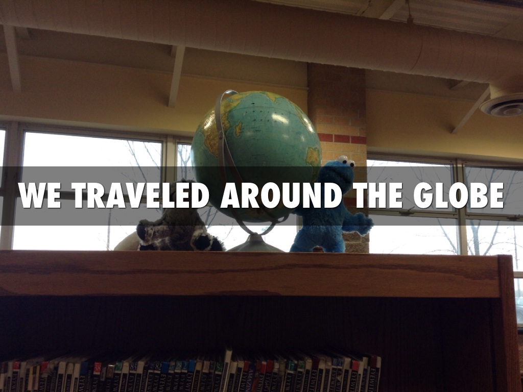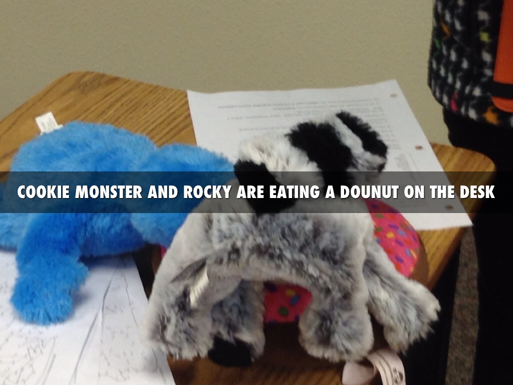 COOKIE MONSTER AND ROCKY ARE EATING A DOUNUT ON THE DESK
