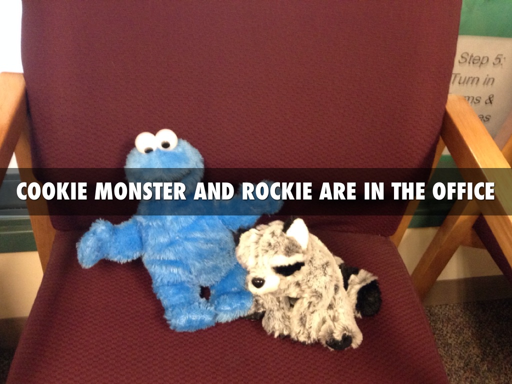 COOKIE MONSTER AND ROCKIE ARE IN THE OFFICE