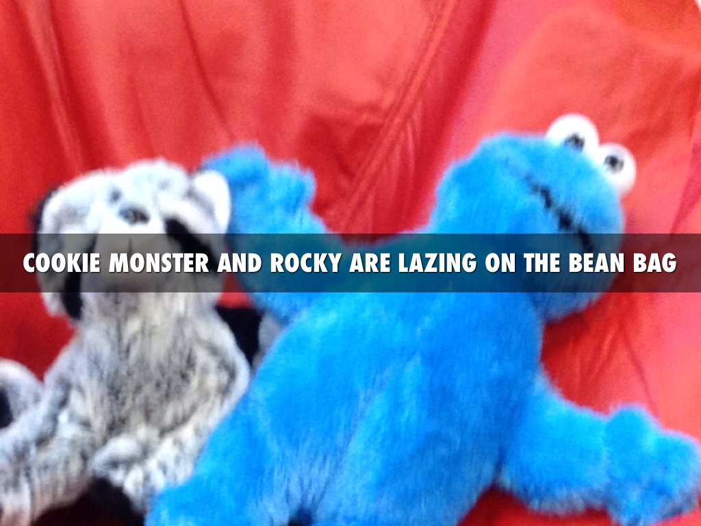COOKIE MONSTER AND ROCKY ARE LAZING ON THE BEAN BAG