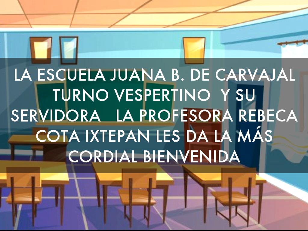 LA ESCUELA JUANA B. DE CARVAJAL TURNO VESPERTINO Y SU SERVIDORA LA PROFESORA REBECA COTA IXTEPAN LES DA LA MÁS CORDIAL BIENVENIDA