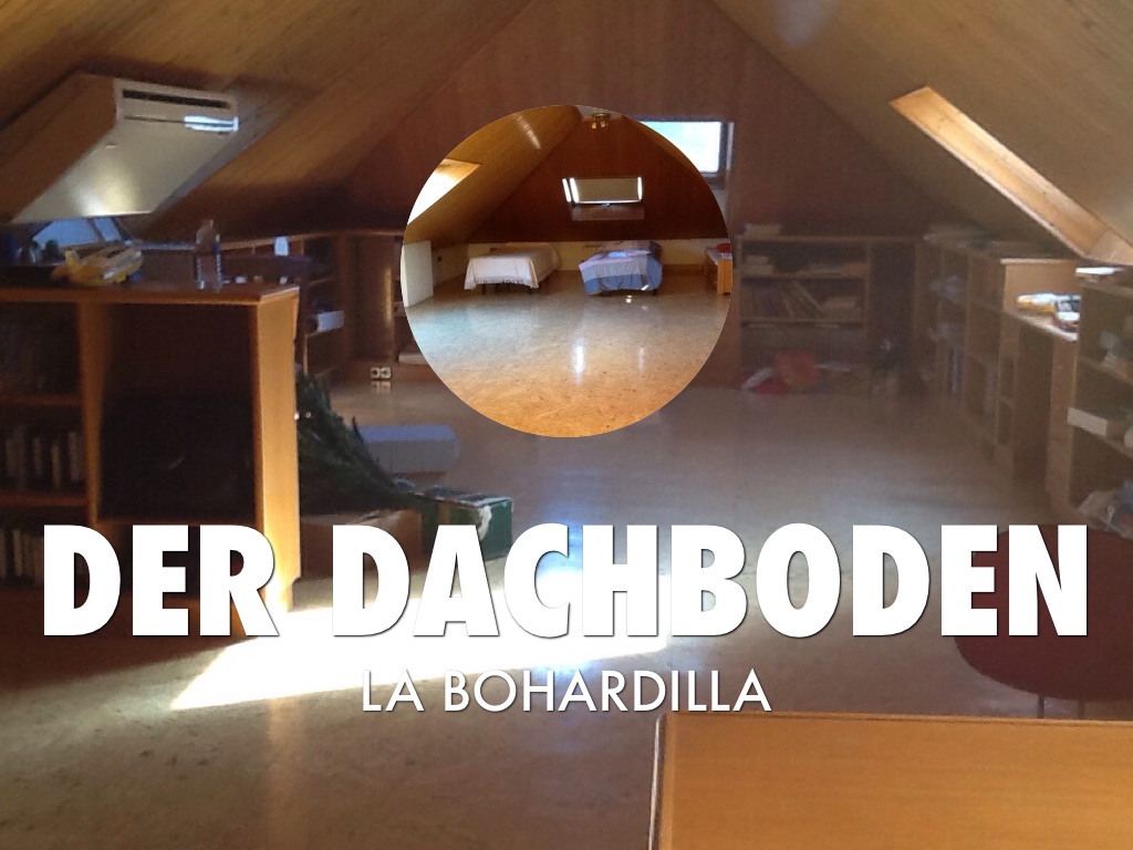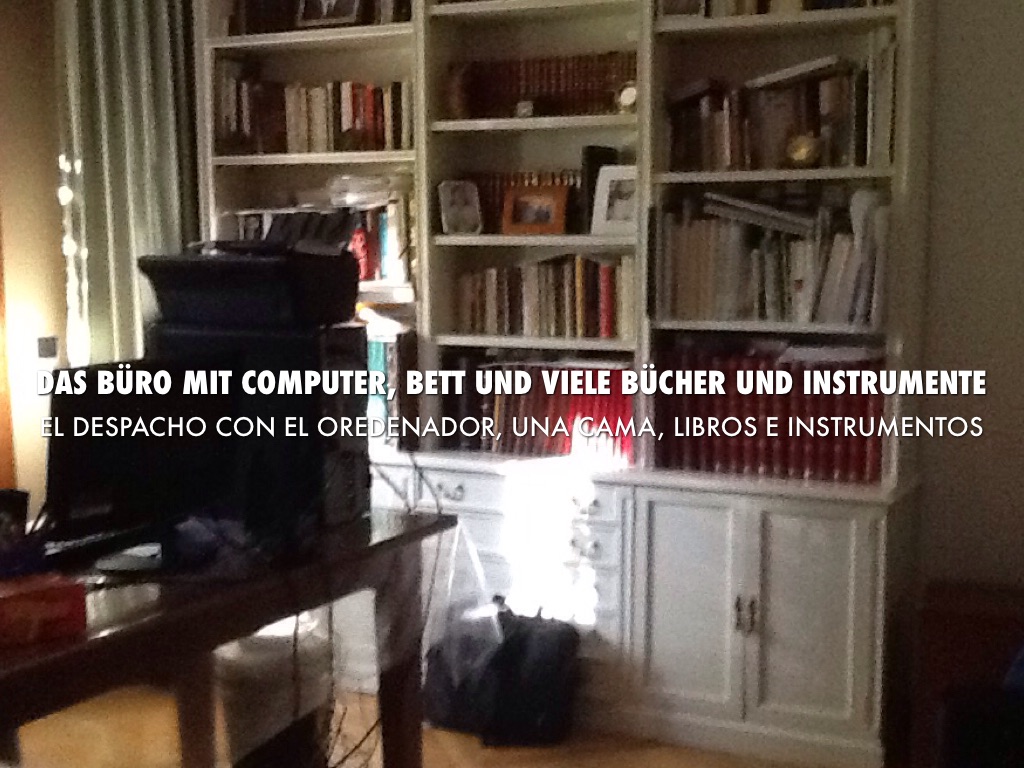 DAS BÜRO MIT COMPUTER, BETT UND VIELE BÜCHER UND INSTRUMENTE