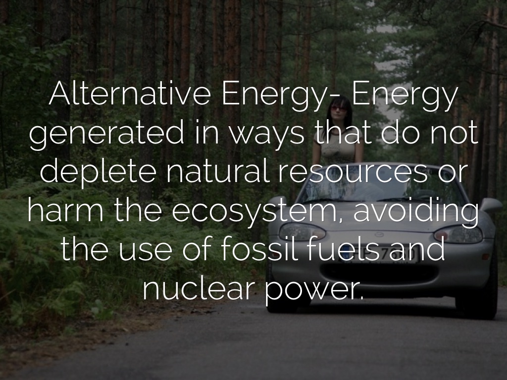 Alternative Energy- Energy generated in ways that do not deplete natural resources or harm the ecosystem, avoiding the use of fossil fuels and nuclear power.