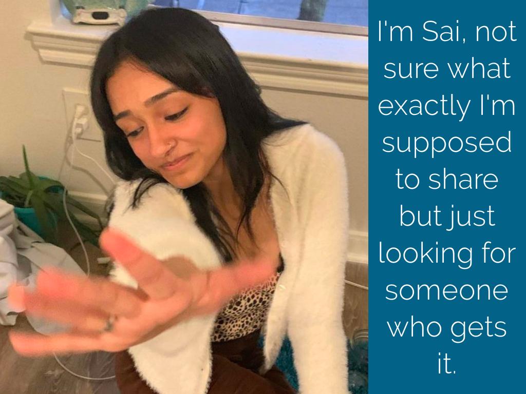 I'm Sai, not sure what exactly I'm supposed to share but just looking for someone who gets it.