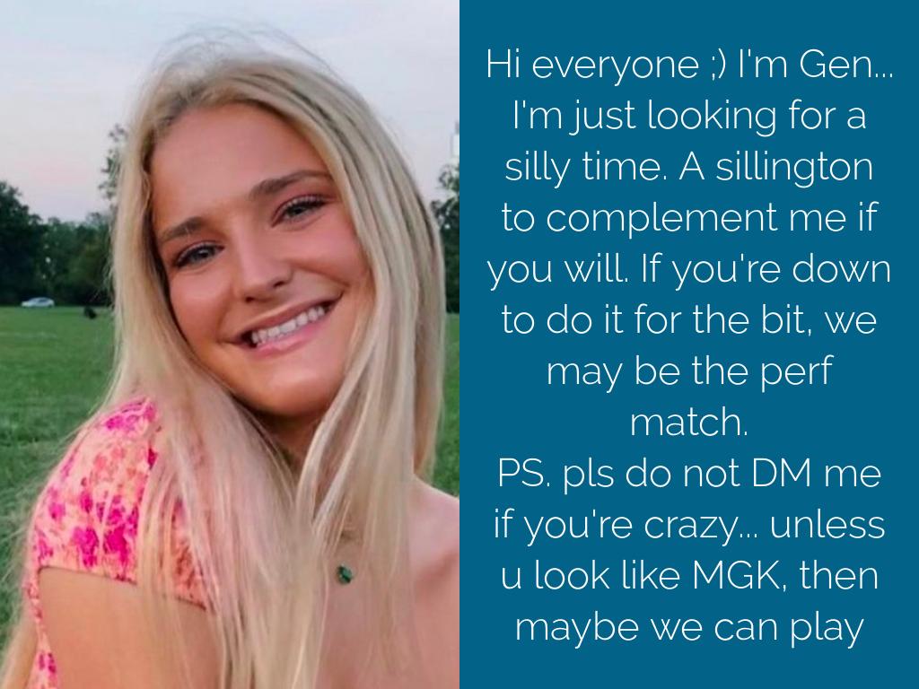 Hi everyone ;) I'm Gen... I'm just looking for a silly time. A sillington to complement me if you will. If you're down to do it for the bit, we may be the perf match.