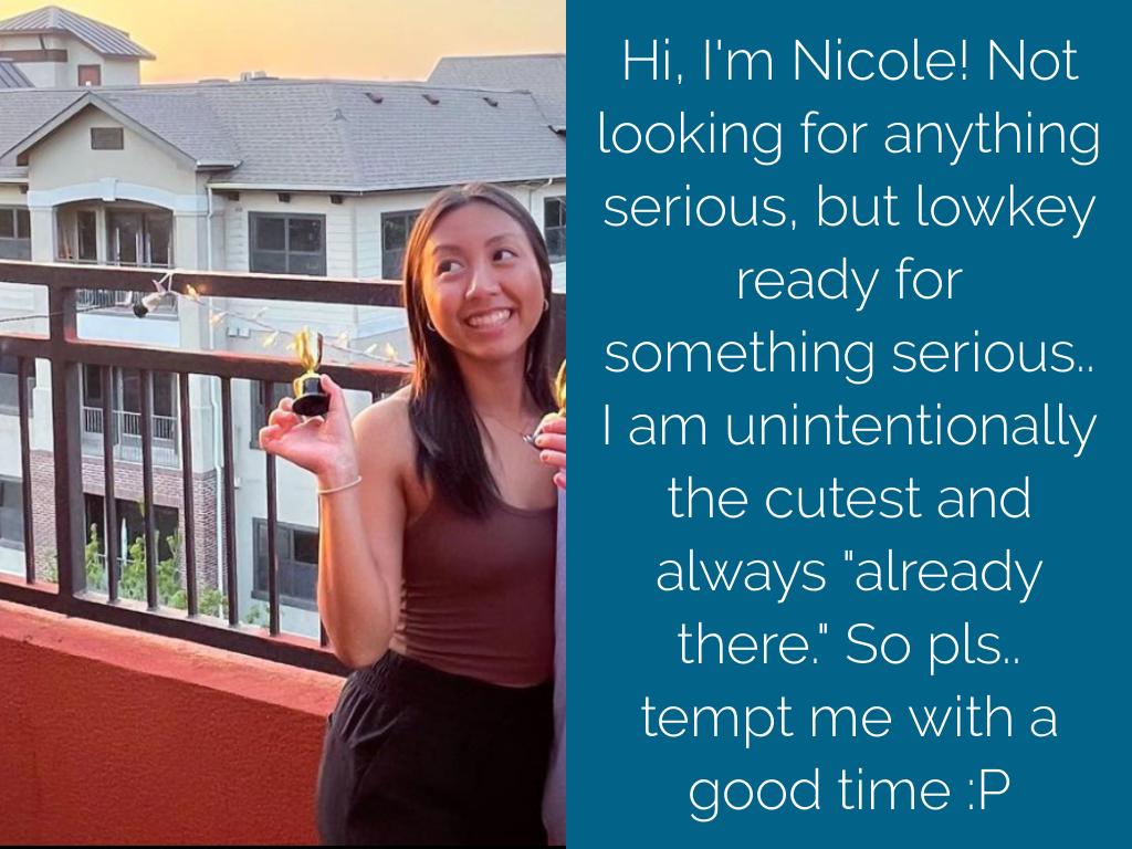 Hi, I'm Nicole! Not looking for anything serious, but lowkey ready for something serious.. I am unintentionally the cutest and always "already there." So pls.. tempt me with a good time :P