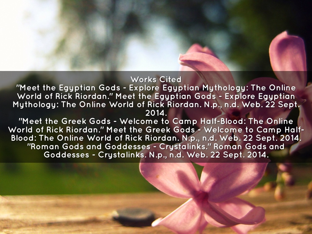 Works Cited "Meet the Egyptian Gods - Explore Egyptian Mythology: The Online World of Rick Riordan." Meet the Egyptian Gods - Explore Egyptian Mythology: The Online World of Rick Riordan. N.p., n.d. Web. 22 Sept. 2014. "Meet the Greek Gods - Welcome to Camp Half-Blood: The Online World of Rick Riordan." Meet the Greek Gods - Welcome to Camp Half-Blood: The Online World of Rick Riordan. N.p., n.d. Web. 22 Sept. 2014. "Roman Gods and Goddesses - Crystalinks." Roman Gods and Goddesses - Crystalinks. N.p., n.d. Web. 22 Sept. 2014.