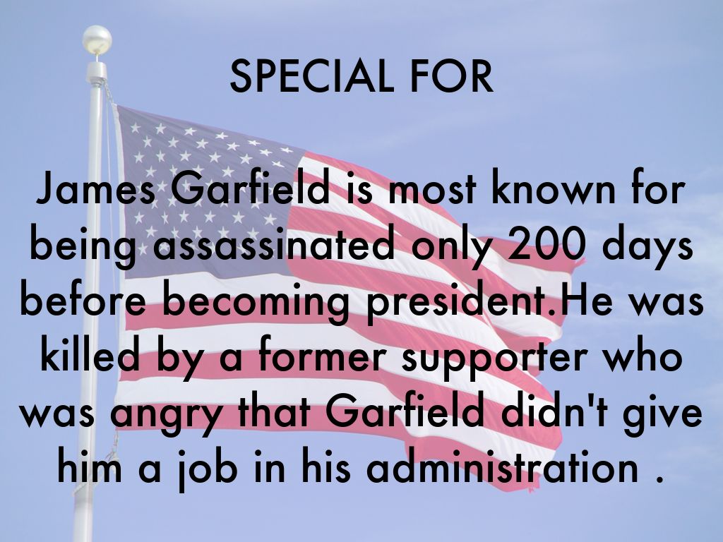 James Garfield is most known for being assassinated only 200 days before becoming president.He was killed by a former supporter who was angry that Garfield didn't give him a job in his administration .